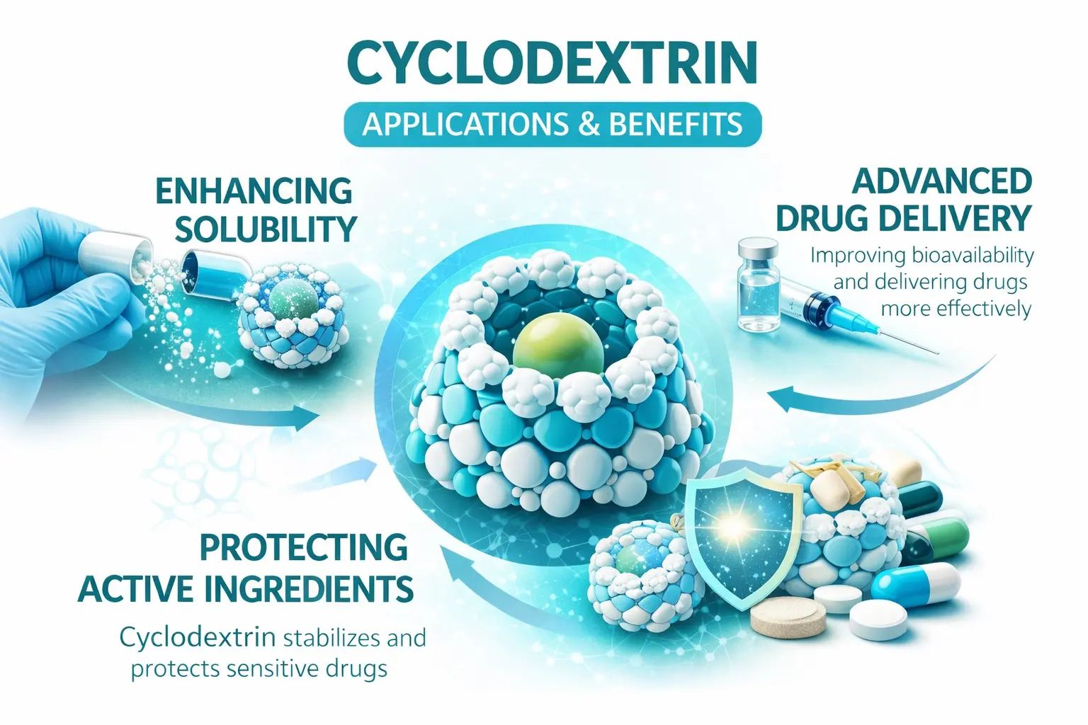 ရေတွင် ကောင်းစွာမပျော်နိုင်သော ဒြပ်ပေါင်းများသည် ဆေးဝါးလုပ်ငန်းအတွက် ပြဿနာတစ်ရပ်အဖြစ် ဆက်လက်ရှိနေပါသည်။ အဆိုပါဒြပ်ပေါင်းများသည်ရောင်းချသောဆေးဝါးများ၏ 40% နှင့်သုတေသနကိုယ်စားလှယ်လောင်းများ၏ 90% ခန့်အပေါ်သက်ရောက်မှုရှိသည်။ Cyclodextrin နည်းပညာသည် တက်ကြွသောပါဝင်ပစ္စည်းများ၏ဖွဲ့စည်းပုံကိုမပြောင်းလဲဘဲ ရေပျော်ဝင်နိုင်မှုပိုမိုကောင်းမွန်စေသည့် ပေါင်းစပ်ရှုပ်ထွေးမှုများကို ဖန်တီးခြင်းဖြင့် ရိုးရှင်းသောအဖြေများကိုပေးပါသည်။